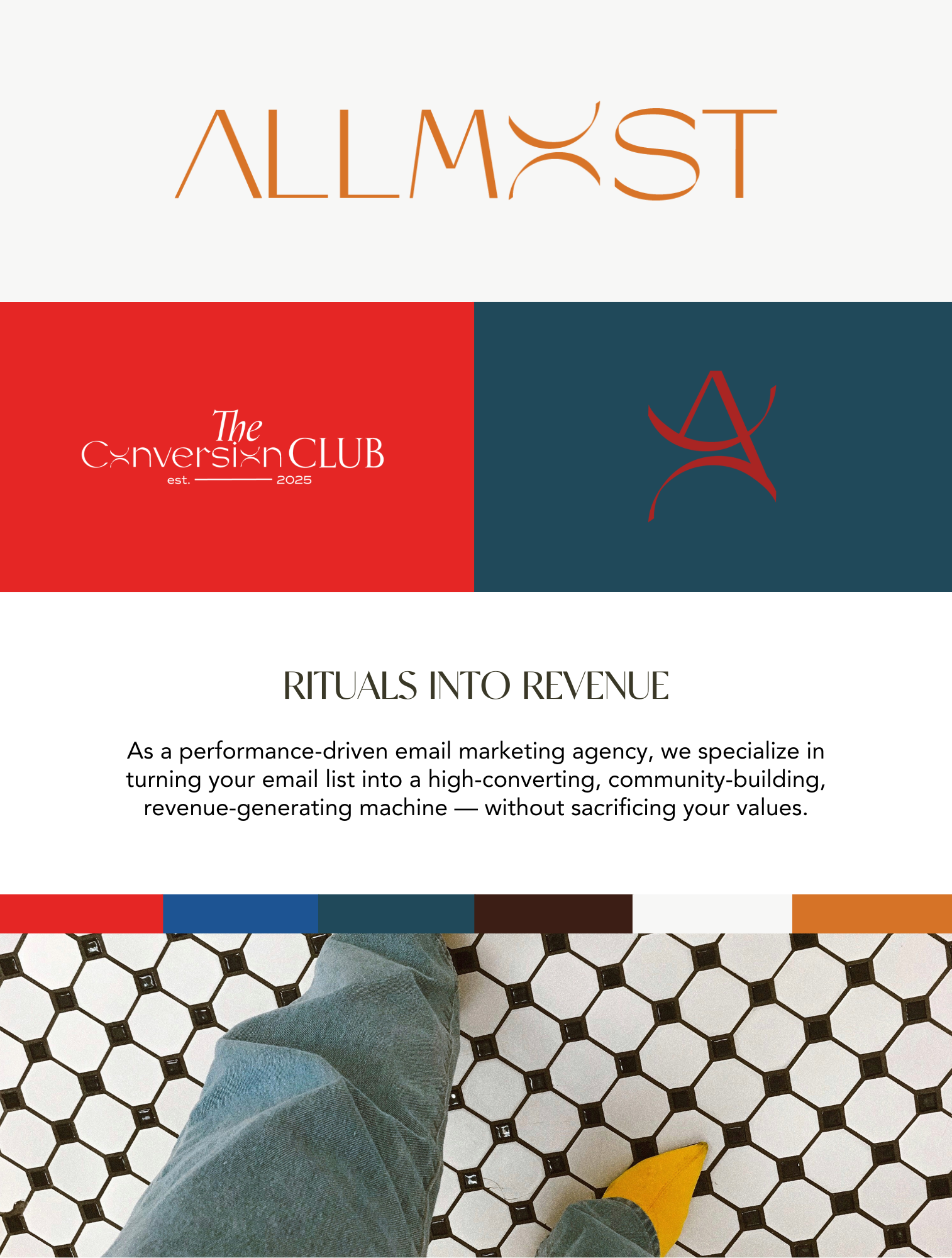 We crafted a visual identity that reflects ALLMOST’s unapologetic clarity and high-converting strategy grounded in clean structure, light movement, and just the right amount of edge. The modern balance of masculine and feminine type, spacious layouts, and purposeful red accents aren’t just design choices, they’re a reflection marking the shift from passive to powerful.